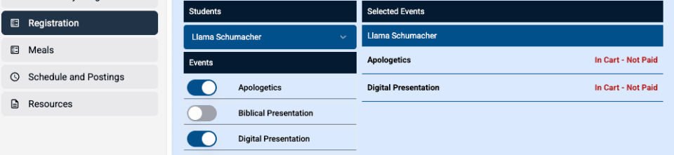 - Prior to registration payment, event exchanges can be made by simply untoggling one event and toggling another.