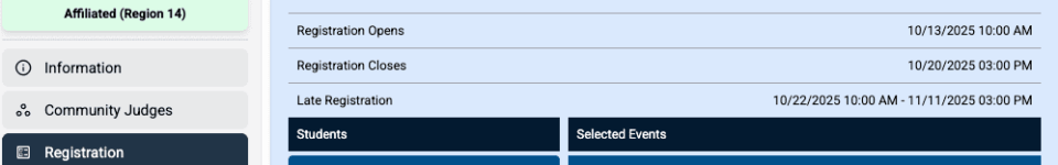 - Late Registration: Opens the day after Registrar Day for available events with a late fee per competitor.