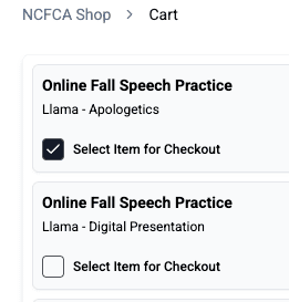 - Check “Select Item for Checkout” under each item in the cart for the events you are ready to pay for.