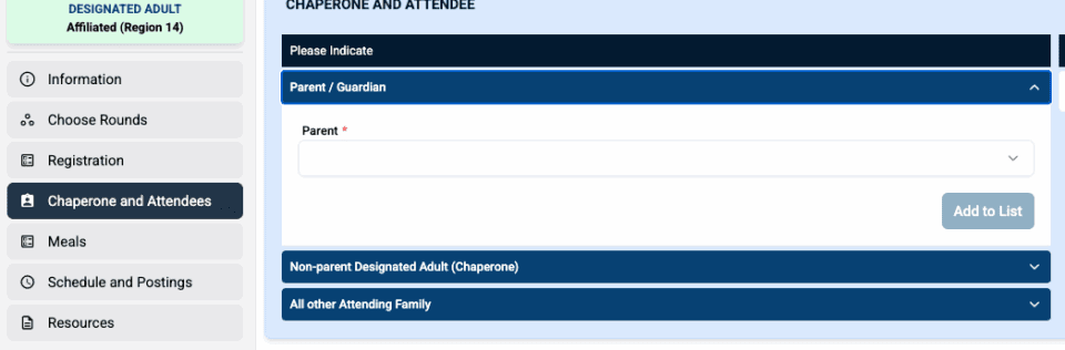 Click the Chaperone and Attendees option from the left-side menu of your chosen tournament to complete the registration process for anyone who will not be a competitor.