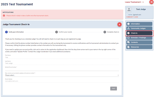 - Click on Check-in and follow the prompts to confirm your contact information and rounds (Community Judges)