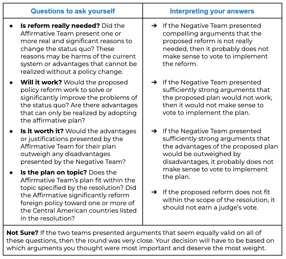 There are a range of reasonable methods judges may use to make a policy debate decision. Debaters may persuade judges to use any reasonable method. In the absence of a clear judging framework, the following questions may be helpful. Remember that it is up to the debaters to make the necessary arguments to earn your vote regardless of how they approach the round.
